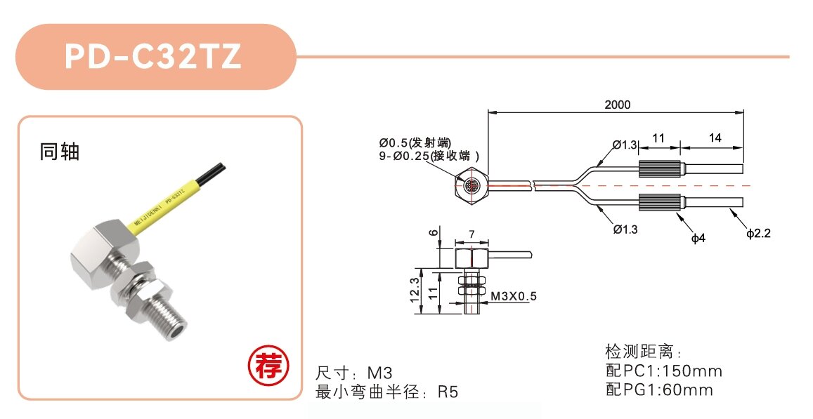 漫反射,M3螺紋,L型出線,線長(zhǎng)2m,檢測(cè)距離:配PG1:60mm;線纜最小彎曲半徑:R5